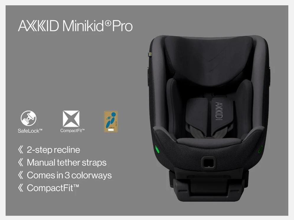 Axkid Minikid 4 Pro je evolucija omiljene Minikid serije — imena koje je postalo sinonim za produženu bezbednost okrenutu „unazad“. Tokom 15 godina razvijalo se originalno auto sedište okrenuto suprotno od kretanja vozila, proširujući domet pomeranjem ograničenja težine i dužine. Minikid 4 Pro je dizajnirano da zaštiti decu od 6 meseci pa sve do 7 godina (61–125 cm). Ovo višestruko testirano sedište garantuje bezbednost do 36 kg. Uzak dizajn, omogućava postavljanje tri sedišta u nizu na zadnjoj klupi auta.