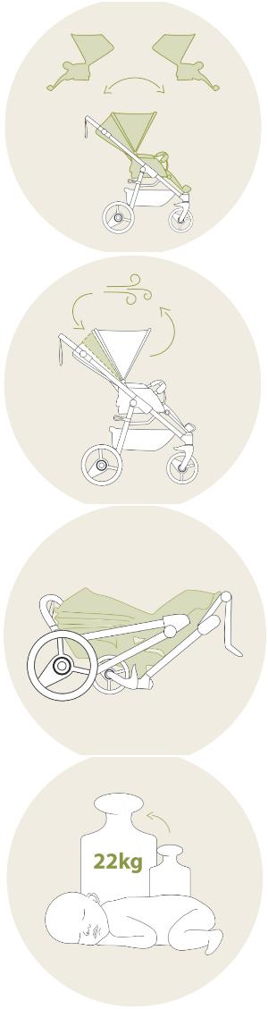 Sedište je reverzibilno, tako da se može koristiti i napred i nazad, odnosno da beba gleda ka onome ko vozi kolica ili ka napred. Nadstrešnica ima ventilacionu mrežu od organskog pamuka, koja se po potrebi može lako otvoriti. Na ovaj način se može izbeći nagomilavanje toplote u kolicima, posebno leti.